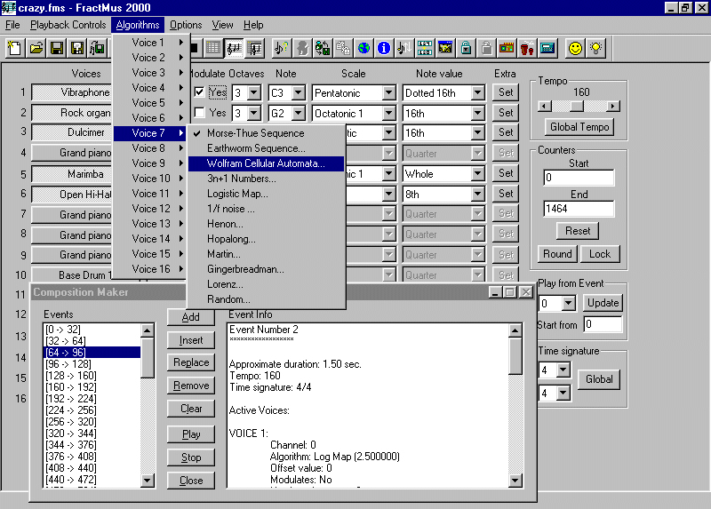 FractMus will create no masterpiece for you, nor it was designed for that. Think of it as a tool which gives you raw material that you can later use in your compositions. Writing a midi file and later importing it with music-editing programs such as Finale or Encore gives you the invaluable option of seeing your creation as a musical score, with all the correct pitches and durations, for later editing. FractMus uses only a few of the infinity of possible algorithms for note creation. Some of them exhibit fractal behavior, like the Morse-Thue sequence, Henon attractor, gingerbread man fractal, etc, while others use well-known formulas from chaotic dynamics, like the Logistic Map.
